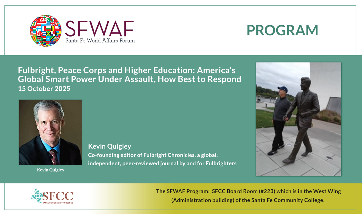 Registration: This SFWAF lunch is $26 for members and $36 for nonmembers. You may pay by check made out to SFWAF and mailed to The Santa Fe World Affairs Forum, Santa Fe, PO Box 31965, NM 87594 or with a credit card using our Paypal account. Please indicate on your check or if using Paypal please note in “add special instructions to the seller” that your payment is for the Thursday, October 16, 2025 program.